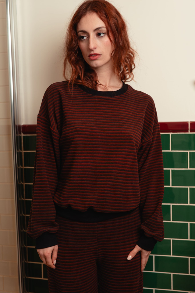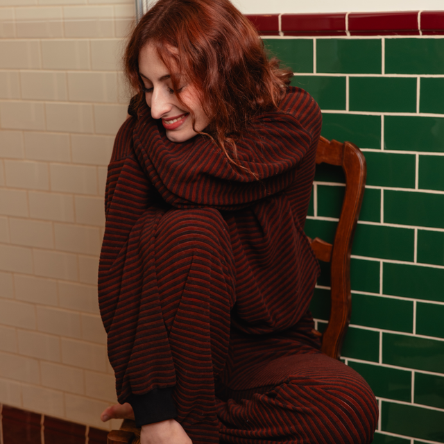 Le sweat Cannelle rayé est fait en matière upcyclée. Sa coupe est loose et il s'associe avec le pantalon Cannelle.
