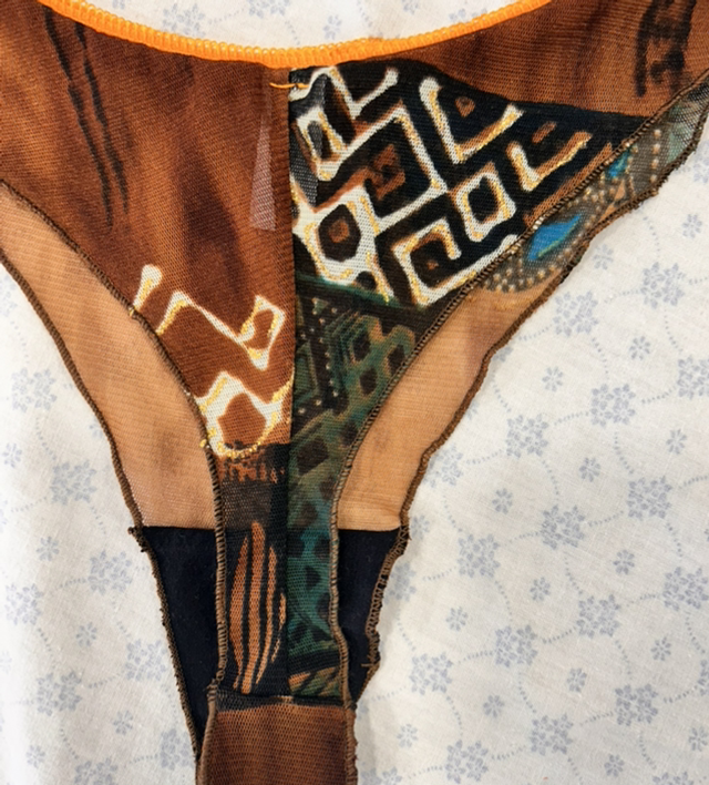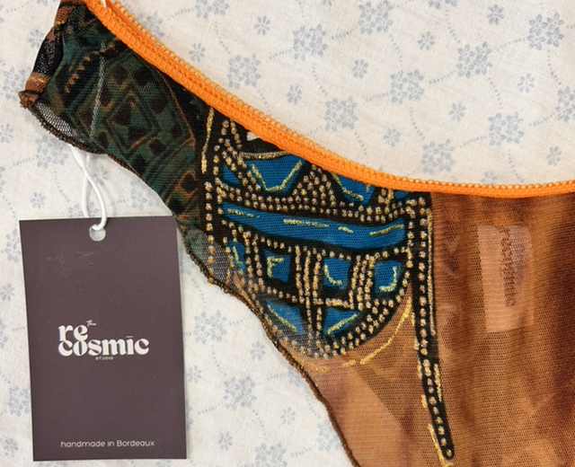Ce tanga issu de tissu upcyclé est un mélange entre légèreté et raffinement grâce à un voile transparent foncé avec quelque reflets dorés.